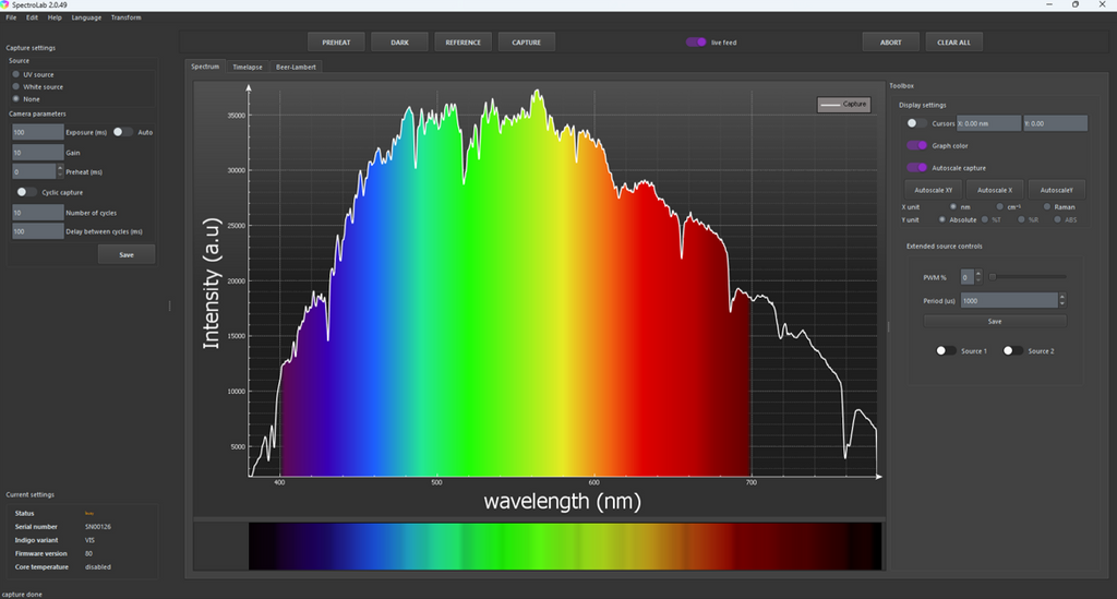 The IndiGo VIS handheld spectrometer is a versatile and portable spectroscopy tool that allows the measurement of absorption, emission, or transmission spectra from 380 nm to 780 nm with a standard resolution of 1.5 nm (FWHM). Designed for mobility and integration, it connects via Bluetooth to Android devices or USB-C to PCs, making it suitable for both field and laboratory use. Its modular design supports a wide range of applications, from chemical analysis to optical filter characterization.